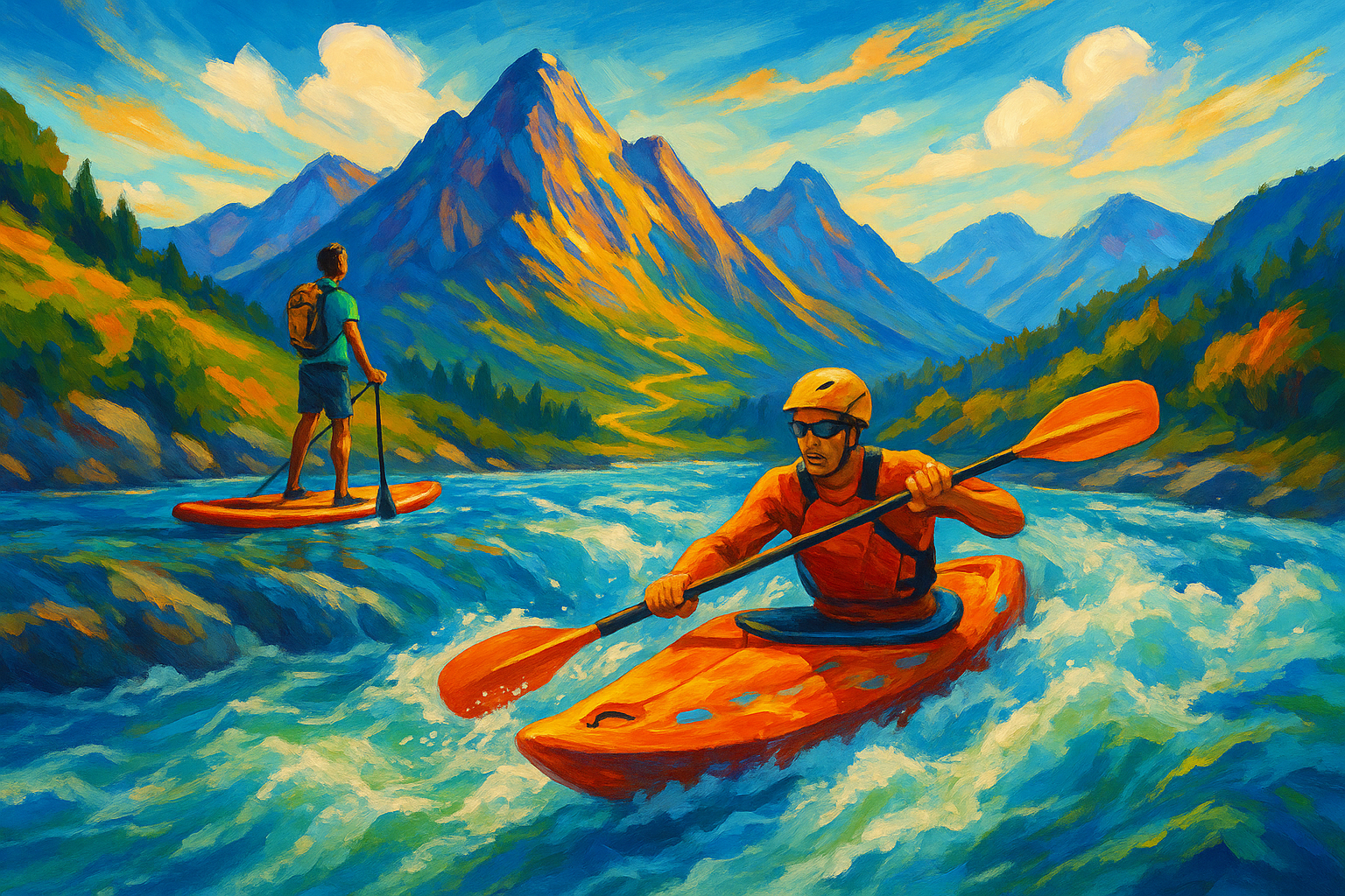Een kleurrijke, geïllustreerde afbeelding toont een persoon die op een SUP board staat op een rustig meer. Daarachter is een kajakker te zien die door kleine stroomversnellingen peddelt. Op de achtergrond verheffen zich hoge bergen met een wandelaar op een pad.